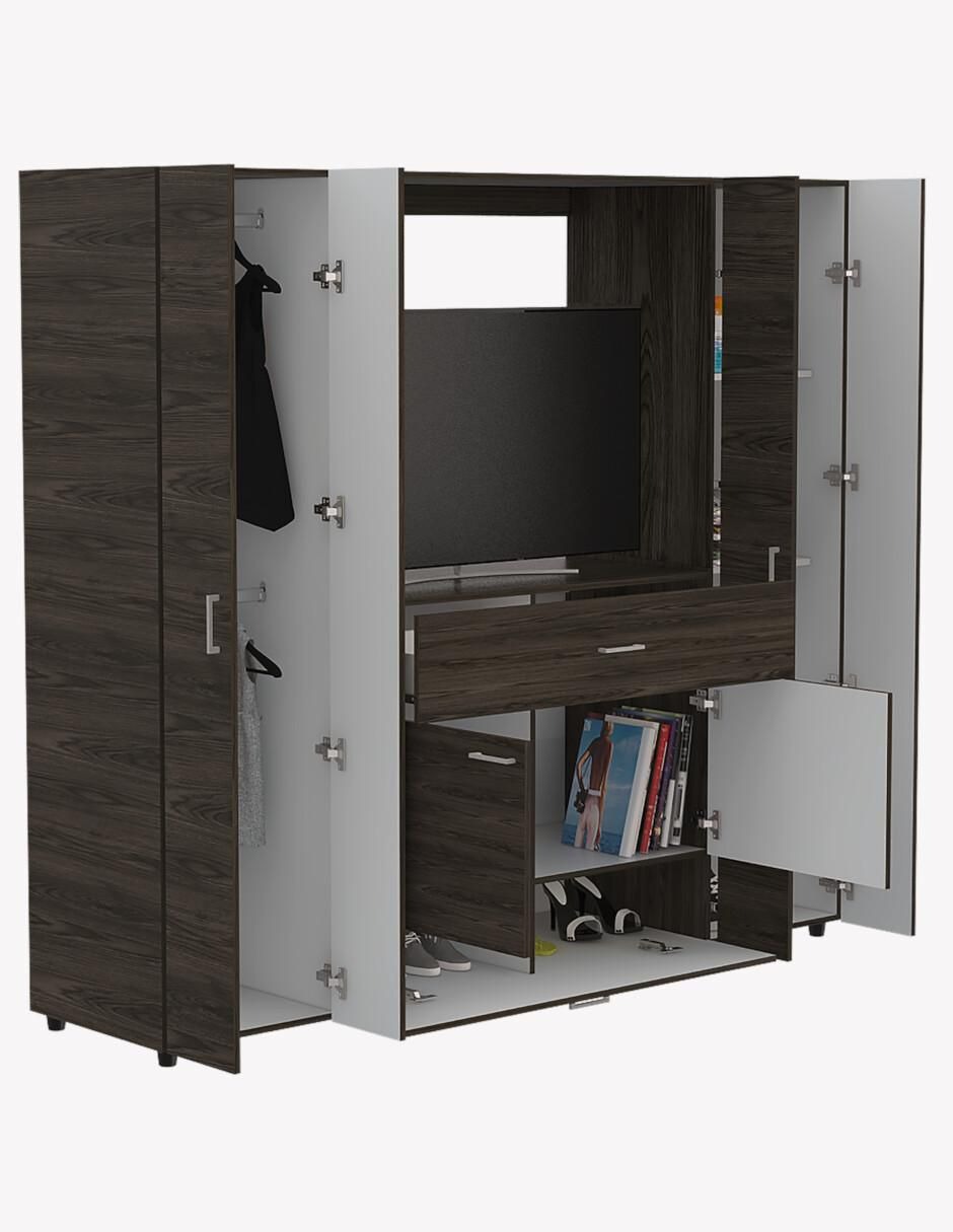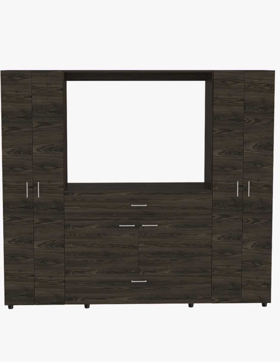Maximiza tu espacio y organiza tu guardarropa con nuestro elegante closet armable en melamina color café. Con ocho entrepaños ajustables, dos robustos tubos para colgar ropa y siete puertas que ofrecen acceso fácil a tus prendas, este closet es una solución completa para tu almacenamiento. Además, cuenta con un cajón para tus accesorios más pequeños y un amplio espacio en el centro, perfecto para colocar una pantalla de hasta 45 pulgadas, fusionando funcionalidad y entretenimiento en un solo lugar. Fabricado con melamina de alta calidad, este closet garantiza resistencia y durabilidad, mientras que su diseño armable facilita el montaje sin complicaciones. Transforma tu espacio con estilo y practicidad gracias a este closet versátil y moderno. Hazte con el tuyo hoy y descubre cómo puedes mejorar la organización y el aspecto de tu hogar de manera fácil y eficiente