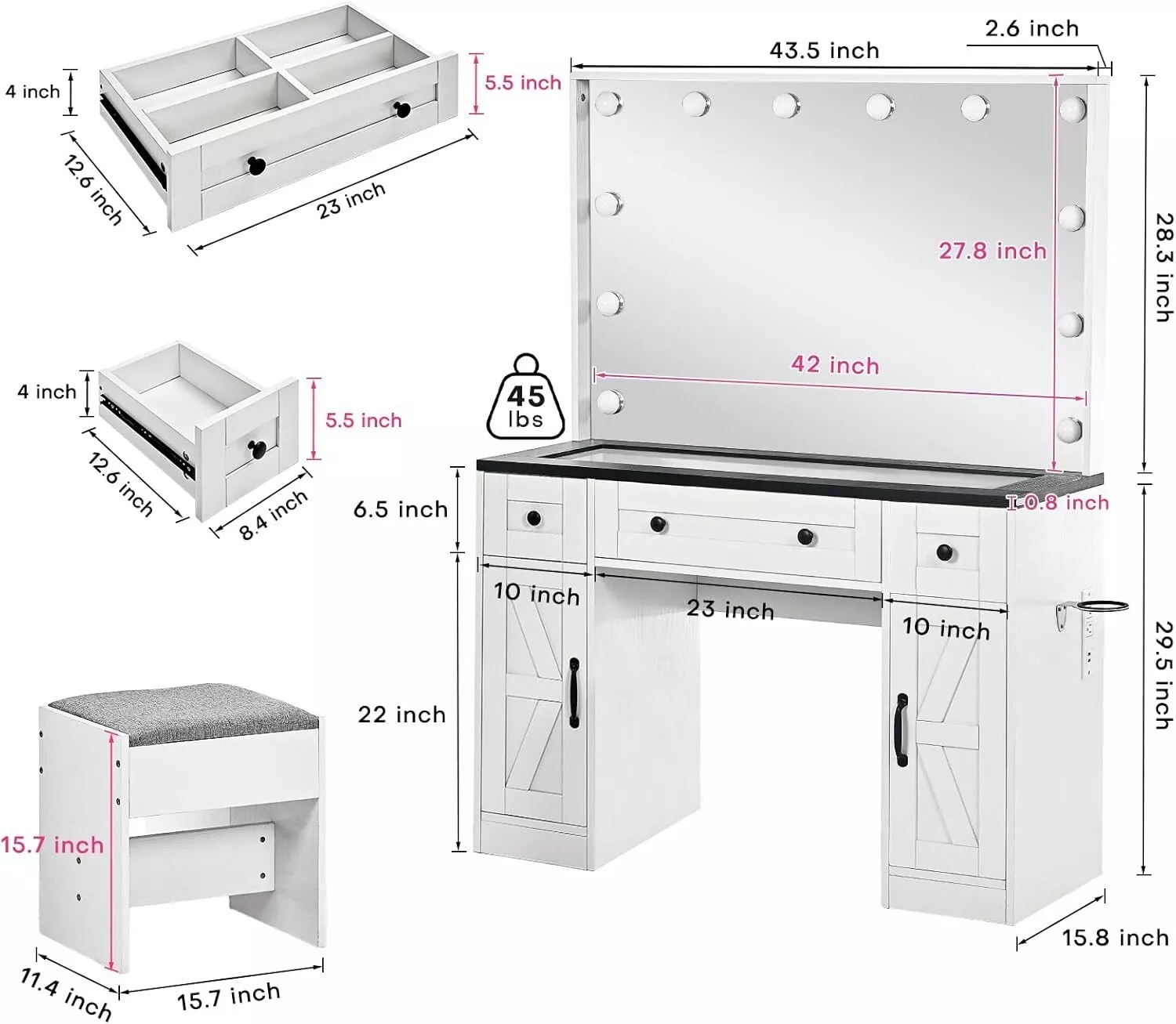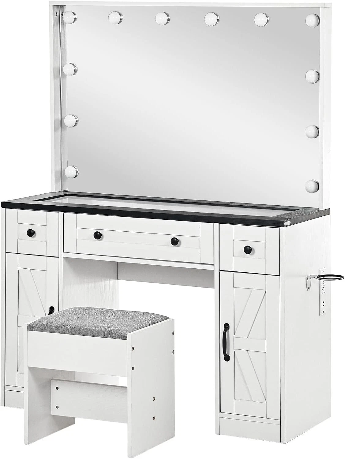 Taburete de Almacenamiento, Con Estación de Carga, Con Cajones, Con Soporte para Secador de Pelo, Con Espejo, Con Taburete, con Luces LED