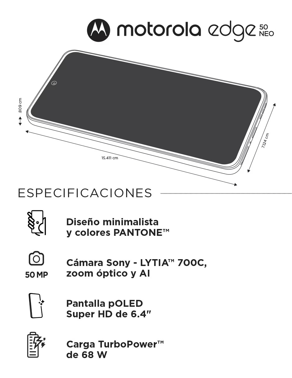 Edge 50 neo, un dispositivo compacto que te permite expresar tu creatividad sin esfuerzo. Su diseño minimalista y sus materiales de primer nivel reflejan la esencia de la sofisticación. Gracias a moto ai, podrás tomar fotos y grabar videos de calidad superior para capturar momentos increíbles. Podrás ver, editar y compartir tu contenido con calidad cinematográfica en una pantalla pOLED Super HD (1,220 p) de 6.4". Recarga rápido y no dejes de crear contenido gracias a la carga TurboPower™ de 68 W. Disfruta de un desempeño superior, con cinco años de actualizaciones de sistema operativo y de seguridad hasta 2029. Incluye audífonos Moto Buds plus