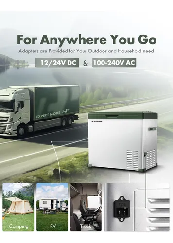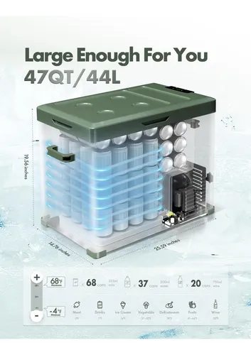 Gran capacidad y funcionamiento silencioso: el refrigerador portátil APremium ofrece una gran capacidad de 47 cuartos de galón 44.7 L para que puedas empacar suficiente comida o cualquier cosa que necesites para el viaje por carretera o picnic familiar. Puede almacenar 68 latas de bebidas 13.2 onzas líquidas o 37 botellas de agua 16.9 fl oz. El refrigerador portátil APremium garantiza que los niveles de ruido se mantengan por debajo de 45 db, proporcionando un ambiente sereno ya sea que estés acampando al aire libre o disfrutando de un paseo tranquilo en tu caravana.