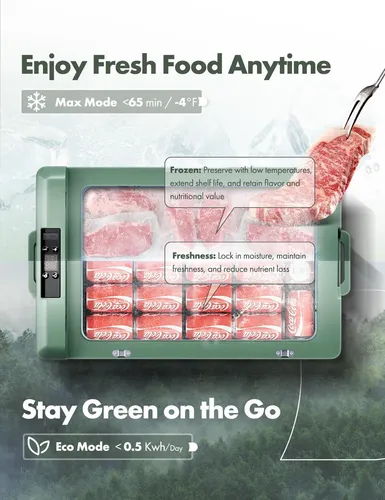 Enfriamiento rápido y dos modos: los modos MAX y ECO en el refrigerador portátil APremium se pueden ajustar según lo necesites. En el modo MAX, el compresor de alta eficiencia del refrigerador puede reducir la wika temperatura a menos 4 F en aproximadamente 65 minutos, perfecto para cuando necesites congelar artículos rápidamente. En el modo ECO, el refrigerador portátil reduce su consumo de energía operativa a menos de 0,5 Kwh/día.