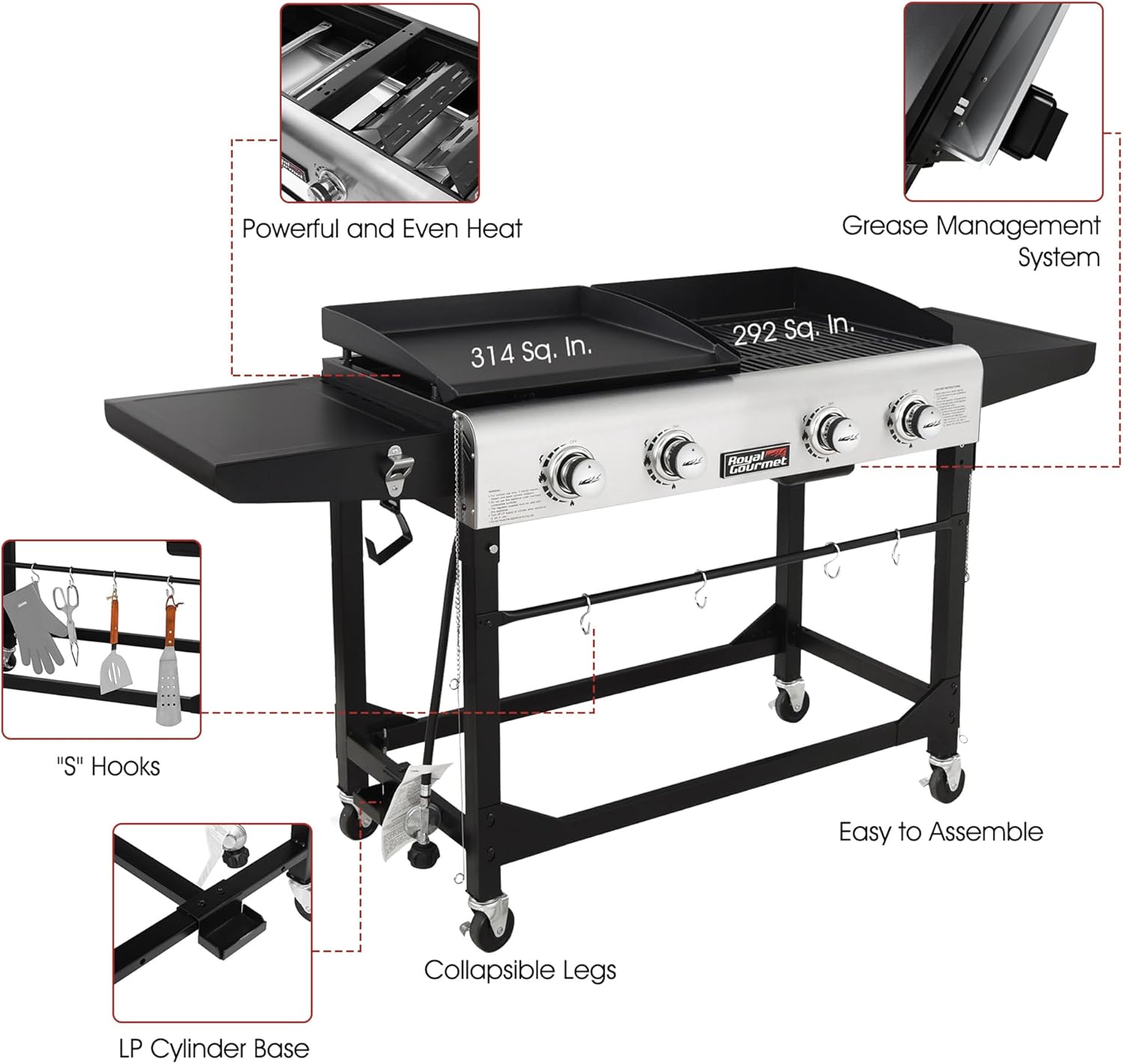 Parrilla o plancha, eso ya no será un problema. Royal Gourmet GD401 Premium Parrilla plegable de gas con 4 quemadores ofrece una función 2 en 1. Con el diseño fácil de usar, el trabajo de montaje se minimiza y se puede realizar en 15 minutos. El combo proporciona un total de 584 metros cuadrados. zona de cocción en pulgadas. Con cuatro potentes quemadores, el combo ofrece 48.000 BTU de salida en total. El sistema de encendido automático ofrece un calentamiento rápido y uniforme. Los accesorios de parrilla colgados en los ganchos de la barra inferior son siempre útiles para su uso.