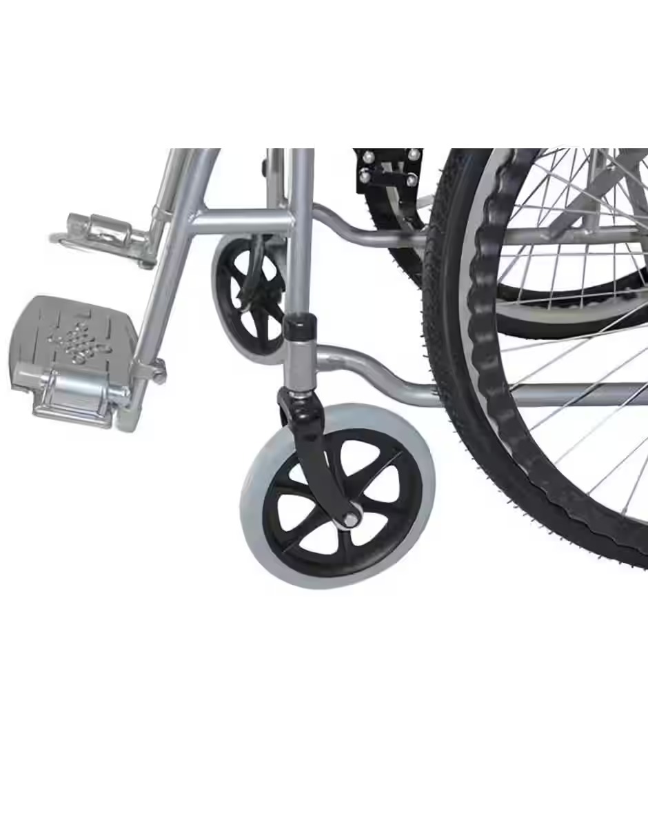 Las ruedas delanteras son neumáticos universales sólidos de 8 pulgadas. Neumático trasero sólido de alta resistencia a la abrasión de 24 pulgadas. Pedal y marco de acero recubierto de polvo plateado. Tubos reforzados y templados. Los apoya brazos son fijos y fáciles de limpiar. Impermeable, fácil de limpiar. Diseño de banda antideslizante, fácil de empujar hacia adelante