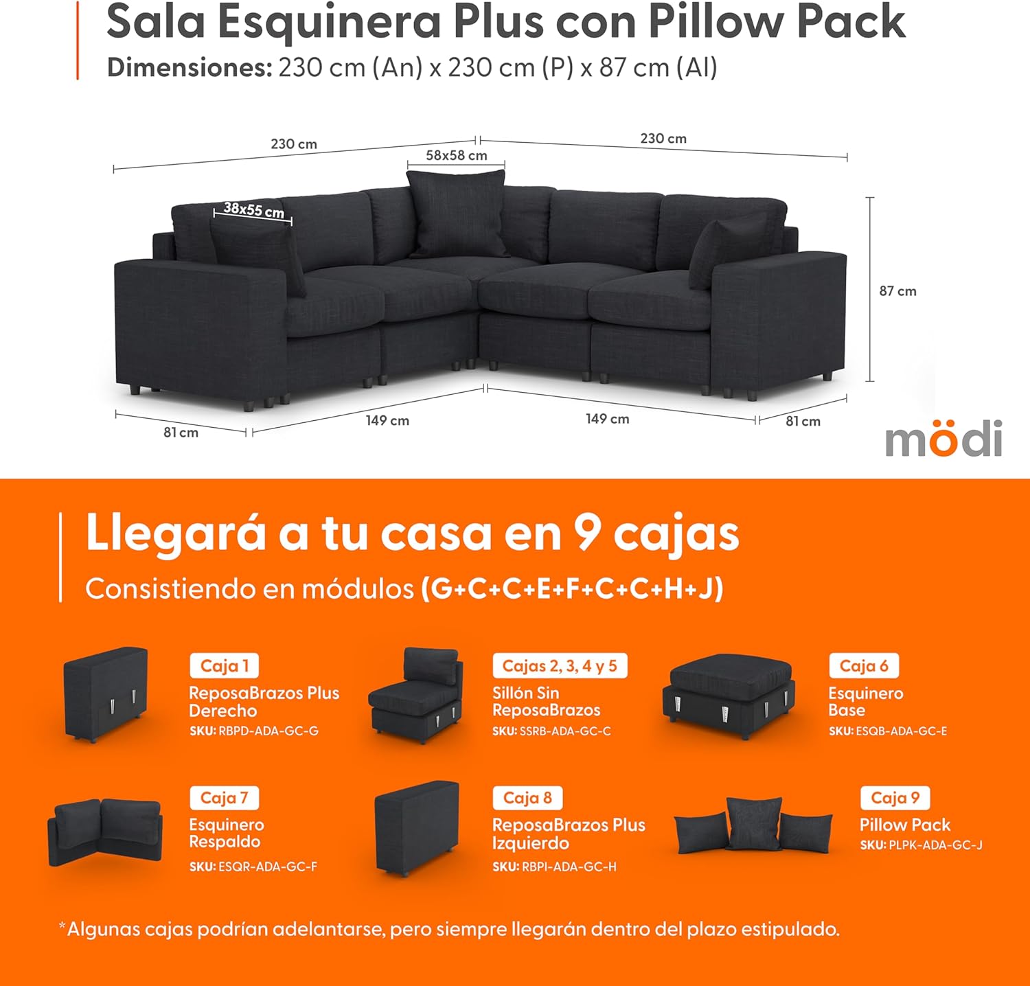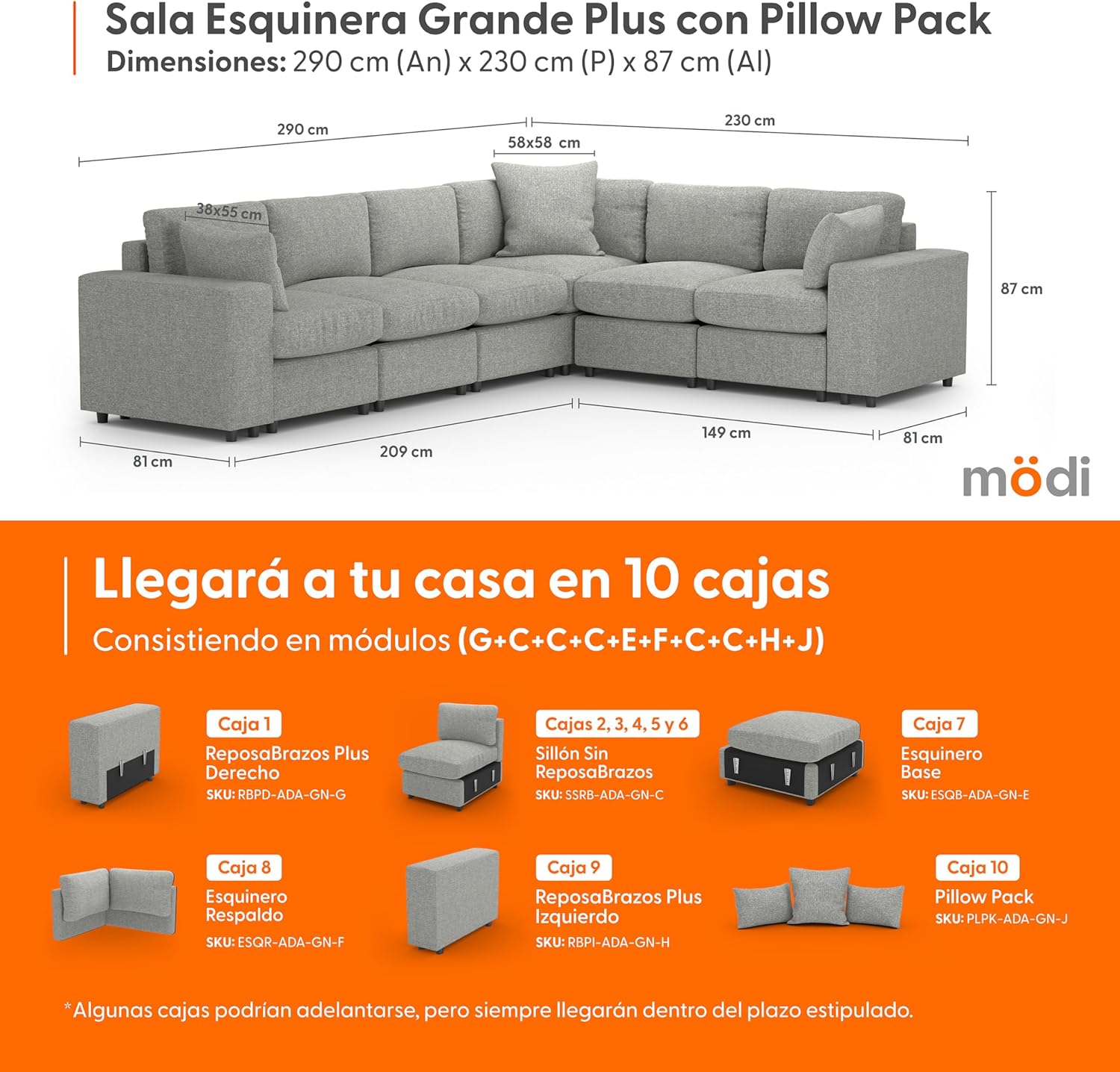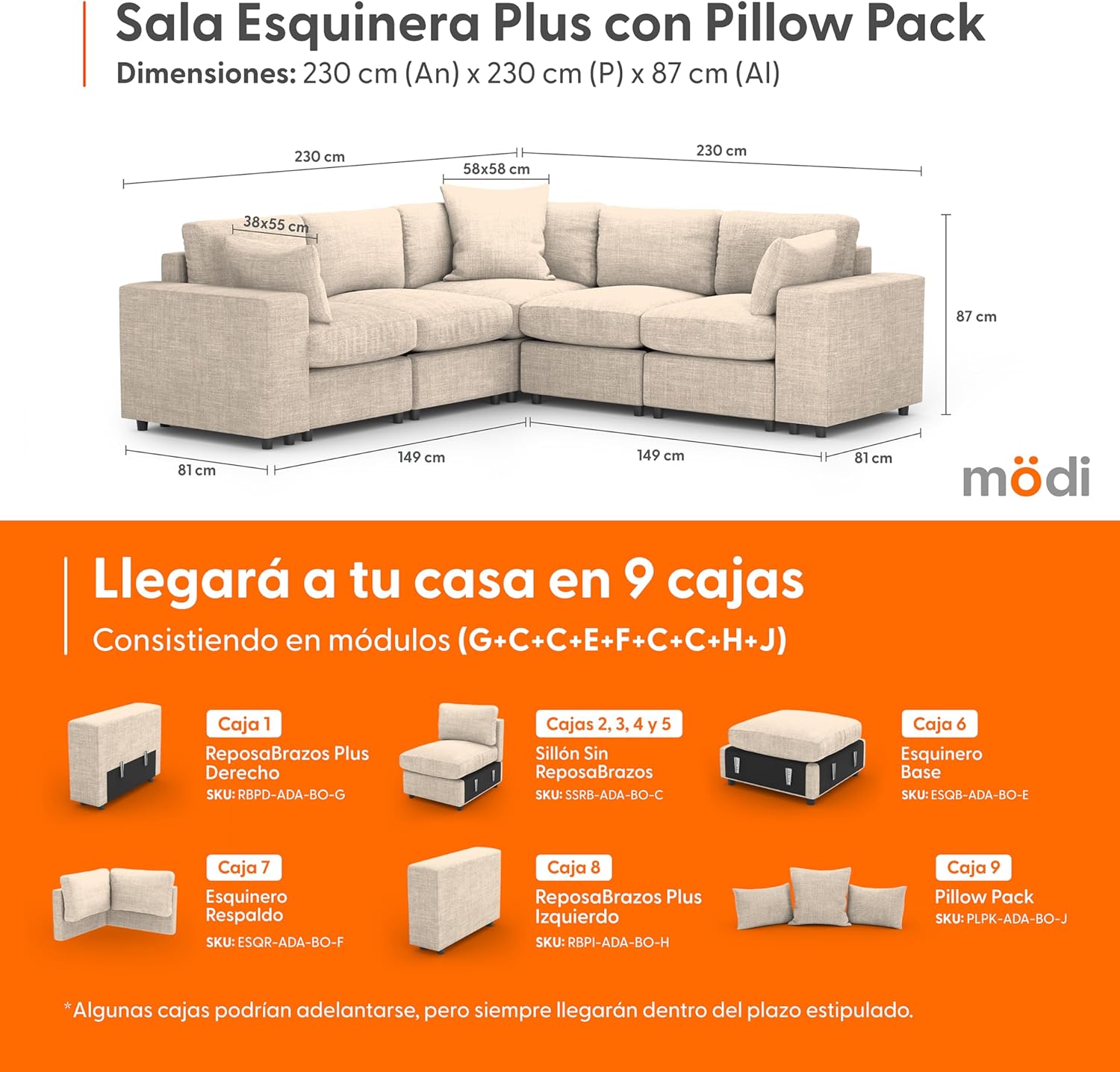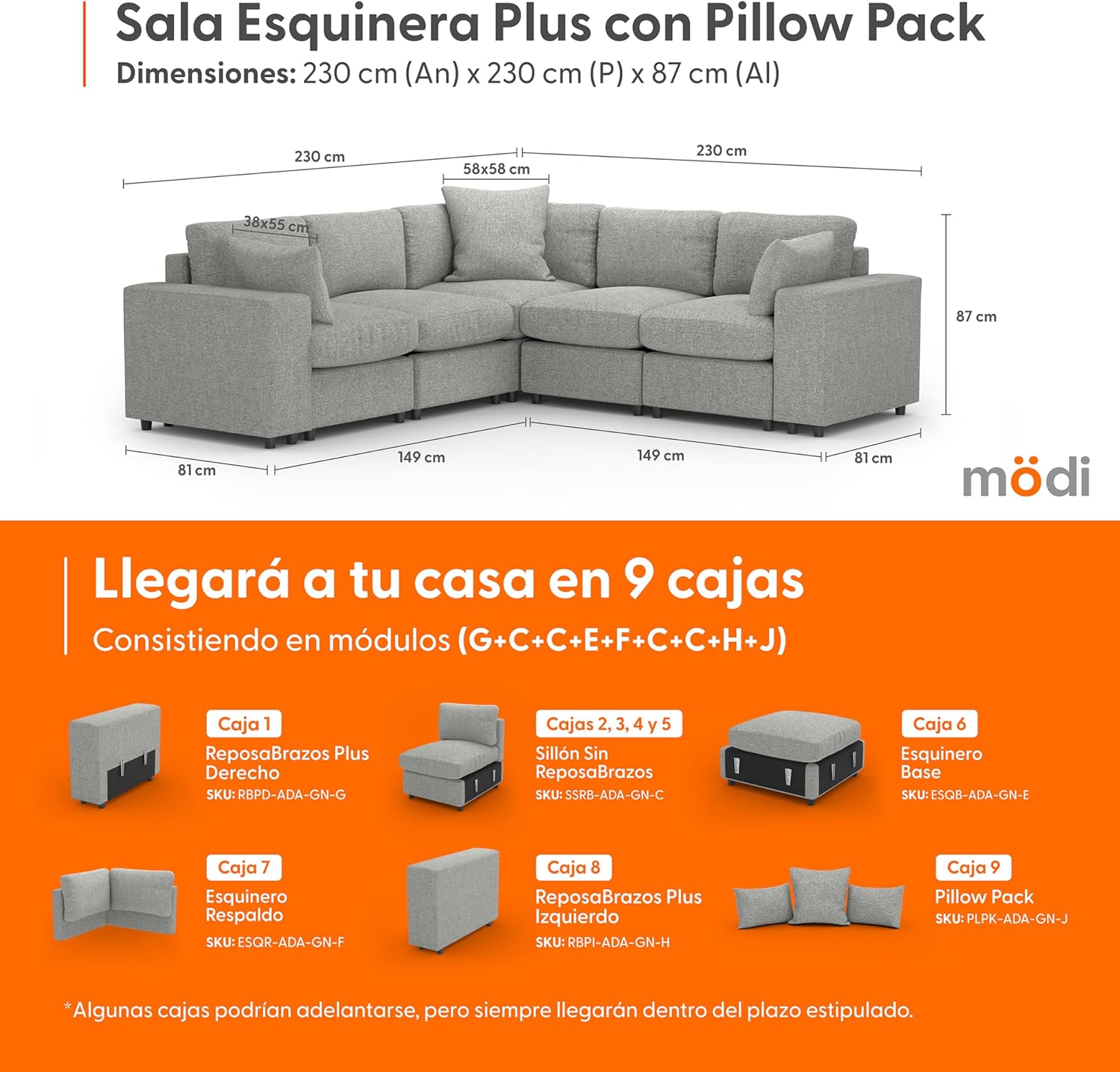 - ⭐ Eleva tu experiencia de sala con nuestra Sala Esquinera Plus MÖDI ADAPTI, la combinación definitiva de espacio y versatilidad. Este kit premium incluye cuatro(4) Módulos C (Sillones Sin RepozaBrazos), un(1) Módulo E (Esquinero Base), un(1) Módulo F (Esquinero Respaldo), un(1) Módulo G (RepozaBrazos Plus Derecho), un(1) Módulo H (RepozaBrazos Plus Izquierdo) y un(1) Módulo J (Pillow Pack). Entregado en once(9) cajas, esta configuración es ideal para quienes buscan una sala que combine máxima capacidad de asiento con flexibilidad de uso.