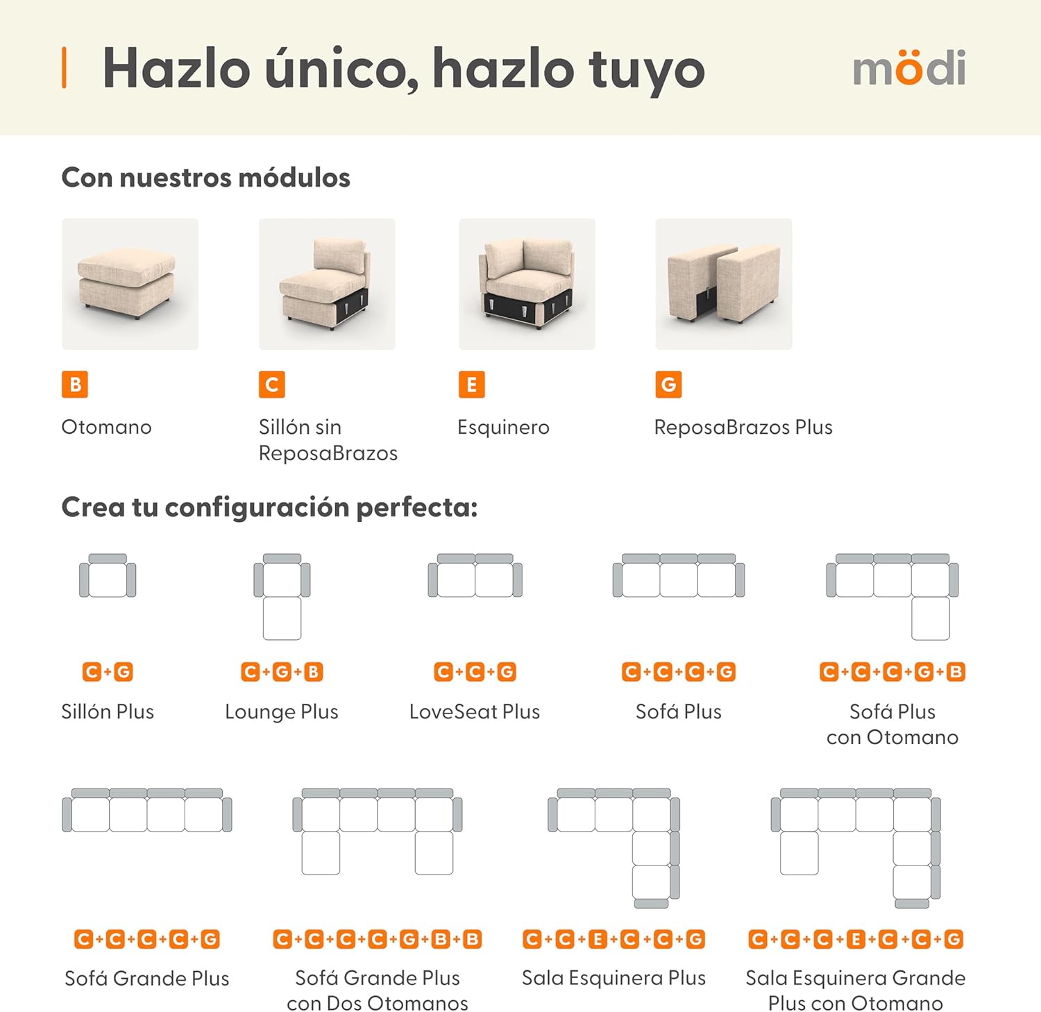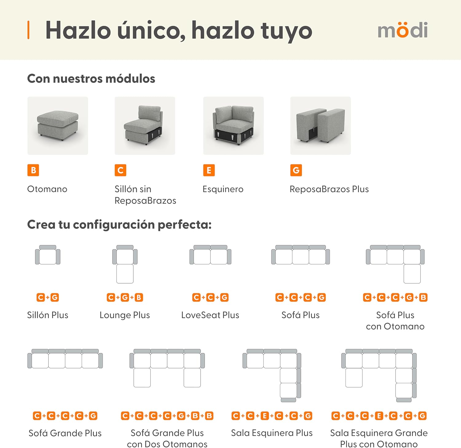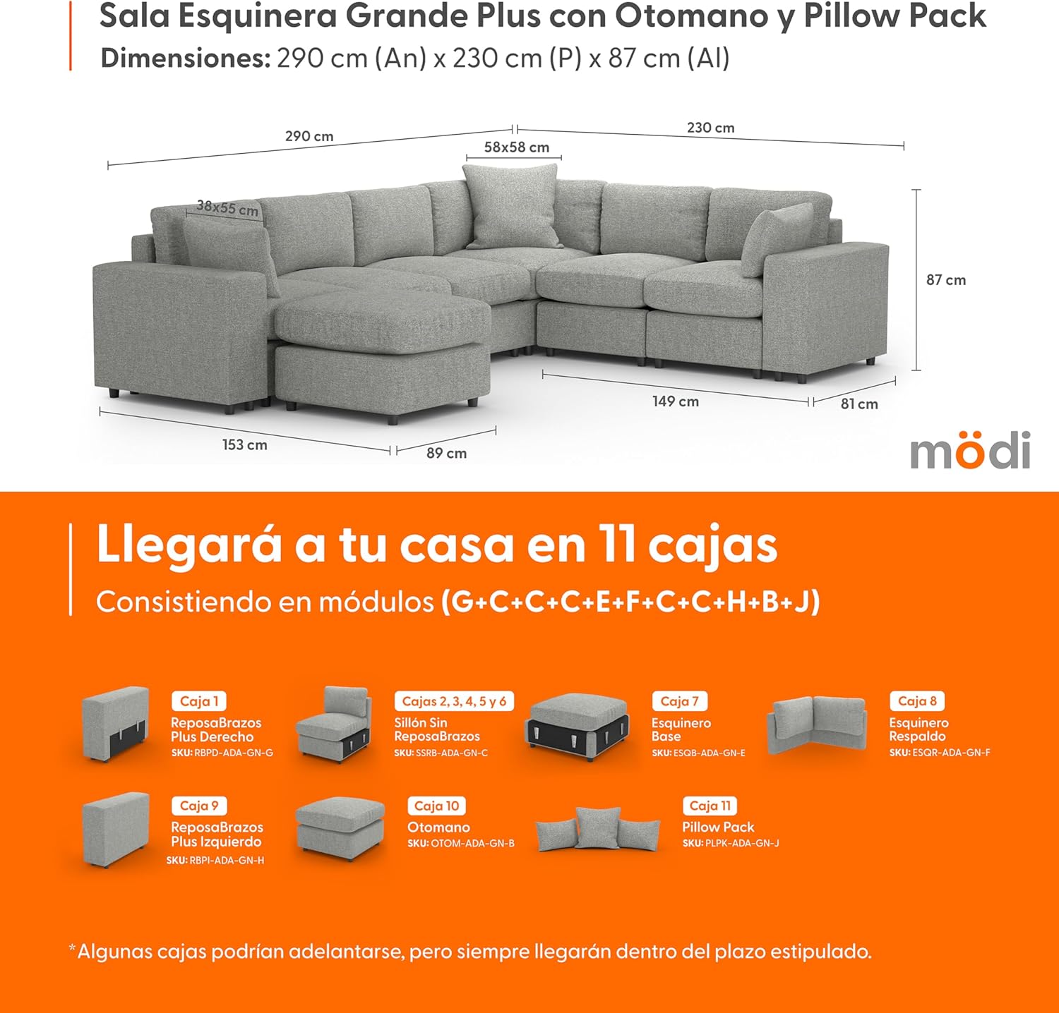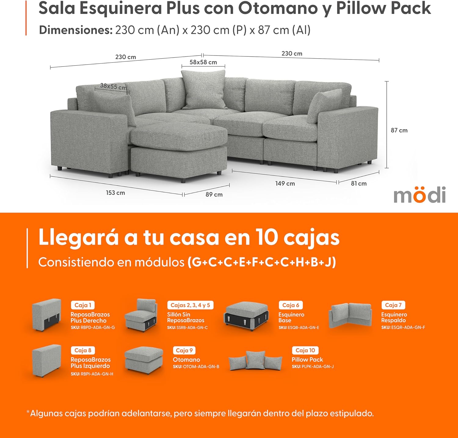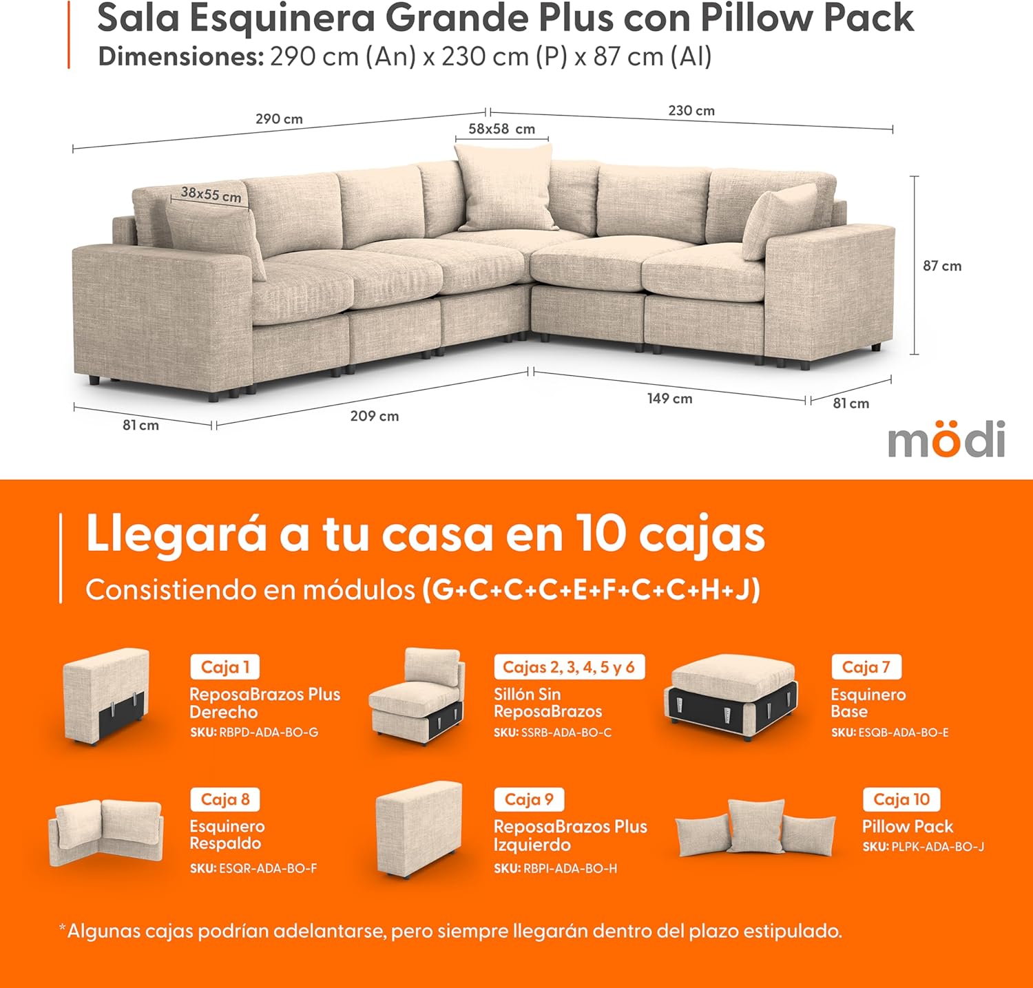 - ⭐ Eleva tu experiencia de sala con nuestra Sala Esquinera Plus MÖDI ADAPTI, la combinación definitiva de espacio y versatilidad. Este kit premium incluye cuatro(4) Módulos C (Sillones Sin RepozaBrazos), un(1) Módulo E (Esquinero Base), un(1) Módulo F (Esquinero Respaldo), un(1) Módulo G (RepozaBrazos Plus Derecho), un(1) Módulo H (RepozaBrazos Plus Izquierdo) y un(1) Módulo J (Pillow Pack). Entregado en once(9) cajas, esta configuración es ideal para quienes buscan una sala que combine máxima capacidad de asiento con flexibilidad de uso.