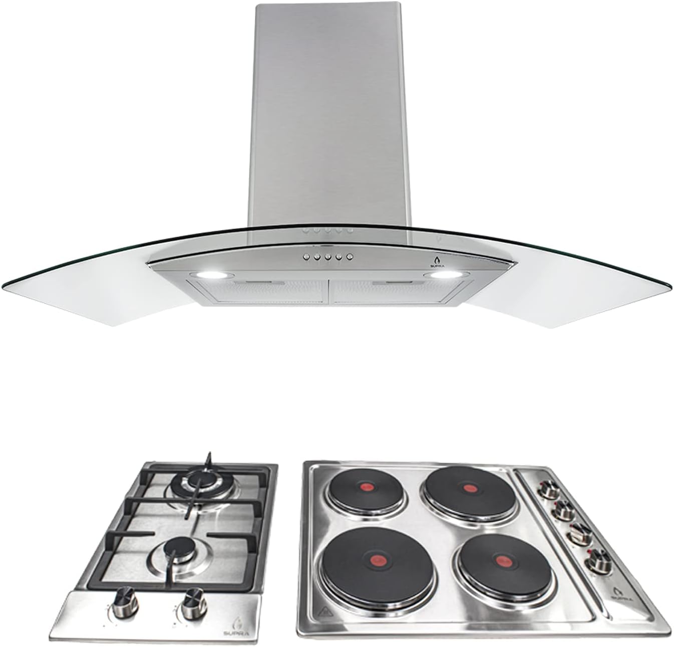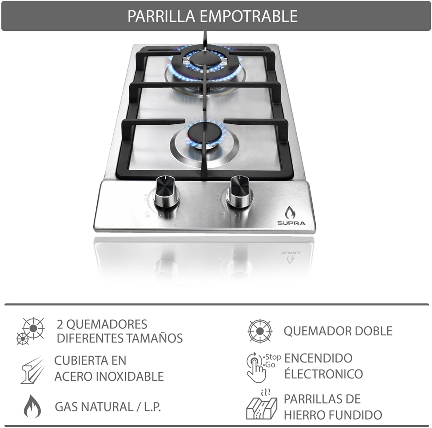 SUPRA Tricombo empotrable Epomeo, Parrilla a gas con 2 Q de 31 cm Mod. DOMINO STEEL, Parrilla eléctrica de 4 Q Mod. 4P TRAMONTO, Campana extractora tipo pared de 90 cm Mod. CC-90