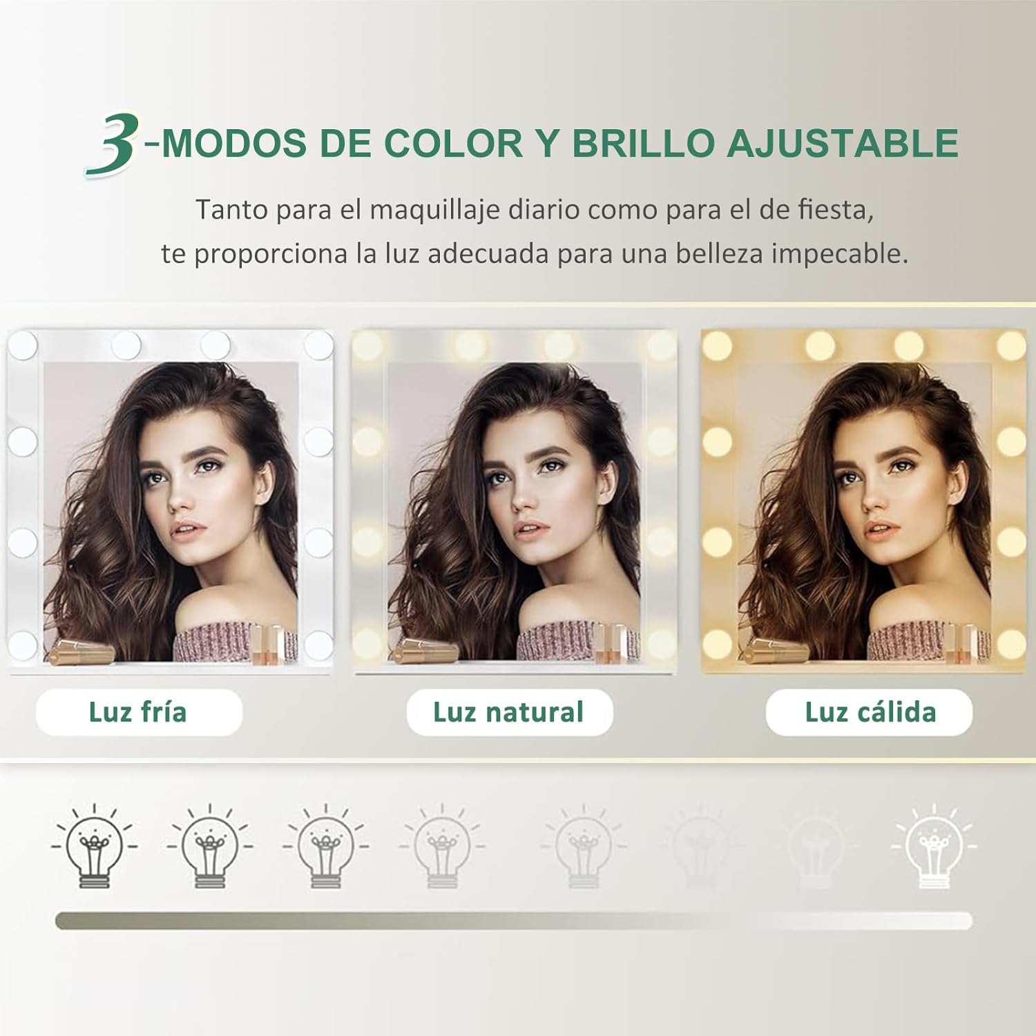 - 【Espejo Deslizante con 3 Modos de Luz】 Nuestro tocador con espejo deslizante incluye focos LED adhesivos con brillo y temperatura de color ajustables. Cambia fácilmente entre luz cálida, natural y fría según tu estado de ánimo, la hora del día o tus necesidades de maquillaje.