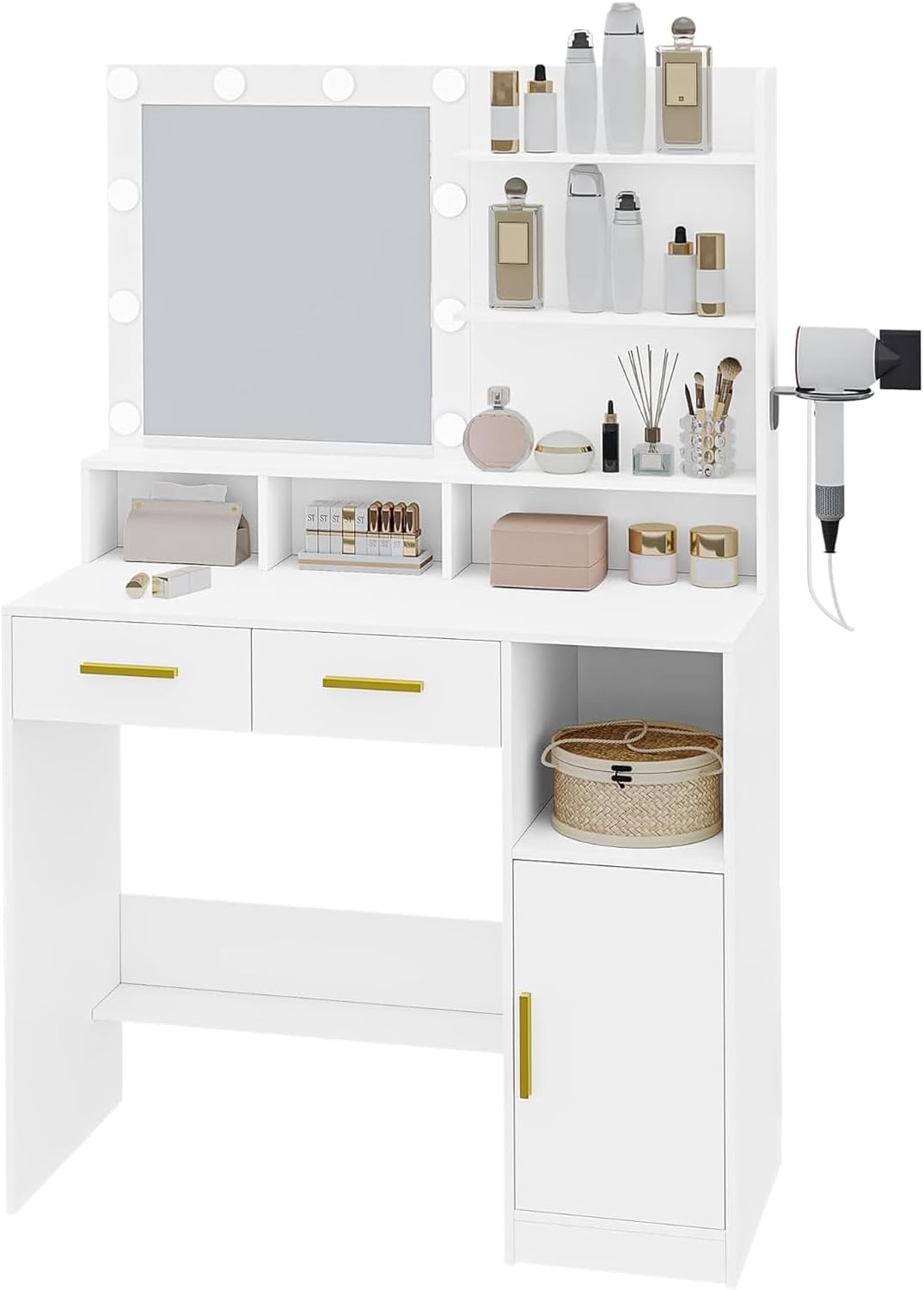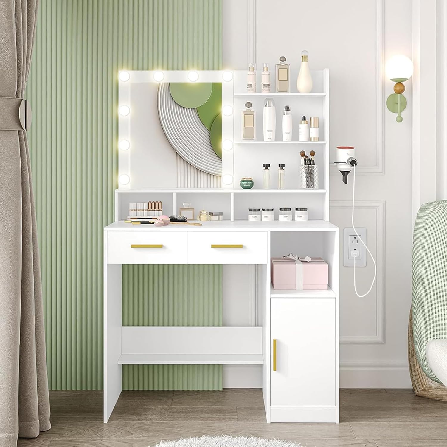 - 【Vanity Tocador De Gran Capacidad】Esta Tocador con 3 Cajones y 1 Armario y 6 Estantes Abiertos. Los estantes de almacenamiento de diferentes alturas pueden almacenar diferentes tipos de cosméticos, productos para el cuidado de la piel, perfumes, etc.